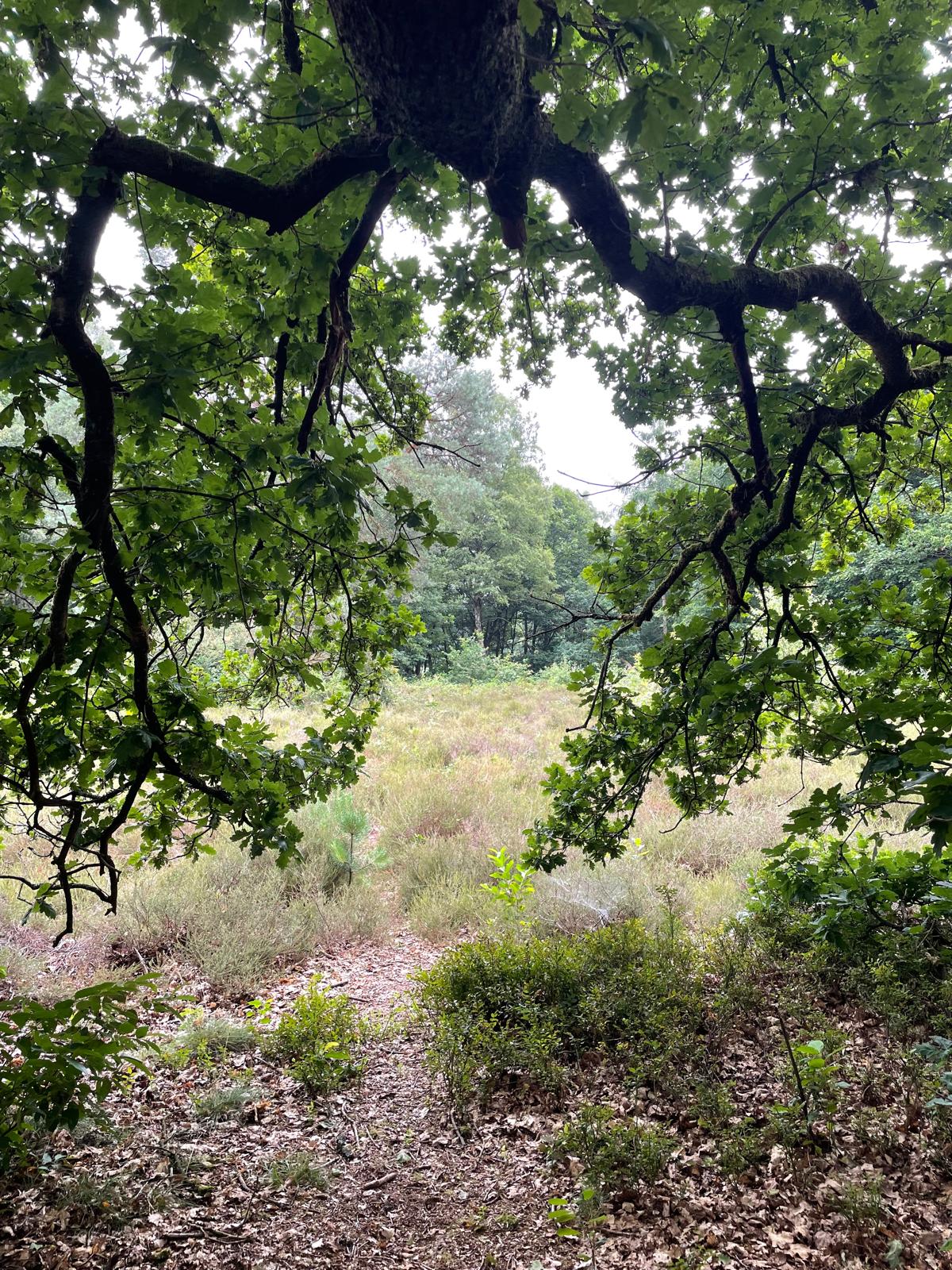Op een dag ben ik het heitje opgelopen. Daar stond een mooie grote eik. De takken reiken tot aan de grond. In de zomer zit je daar verscholen en als het regent blijf je zo goed als droog. Er is een fijn plekje waar je kunt zitten, met je rug tegen de stam. Het is ‘mijn’ eik. Ik kan er rustig een hele poos blijven zitten. Mij één voelen met de boom, met zijn wortels en zijn takken. De wortels die diep de aarde in gaan en de takken die naar het universum reiken. Heerlijk om via de wortels en takken mij op te laden met energie uit de aarde en het universum. Opgeladen kan ik dan weer naar huis.